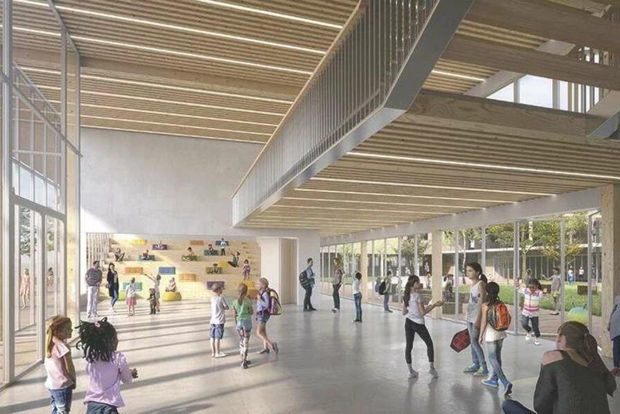 L'enjeu du projet est de faire cohabiter un système constructif en structure bois avec des façades en pierres porteuses : une architecture vertueuse environnementalement avec des façades qualitatives et pérennes issues de ressources locales.