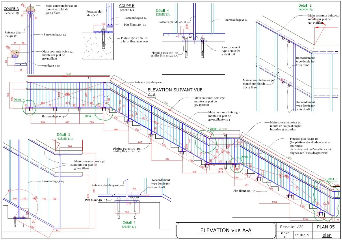 Étude, plan de conception et de fabrication + note de calcul et conduite de travaux. Les photos représentent l'escalier en cours de pose.