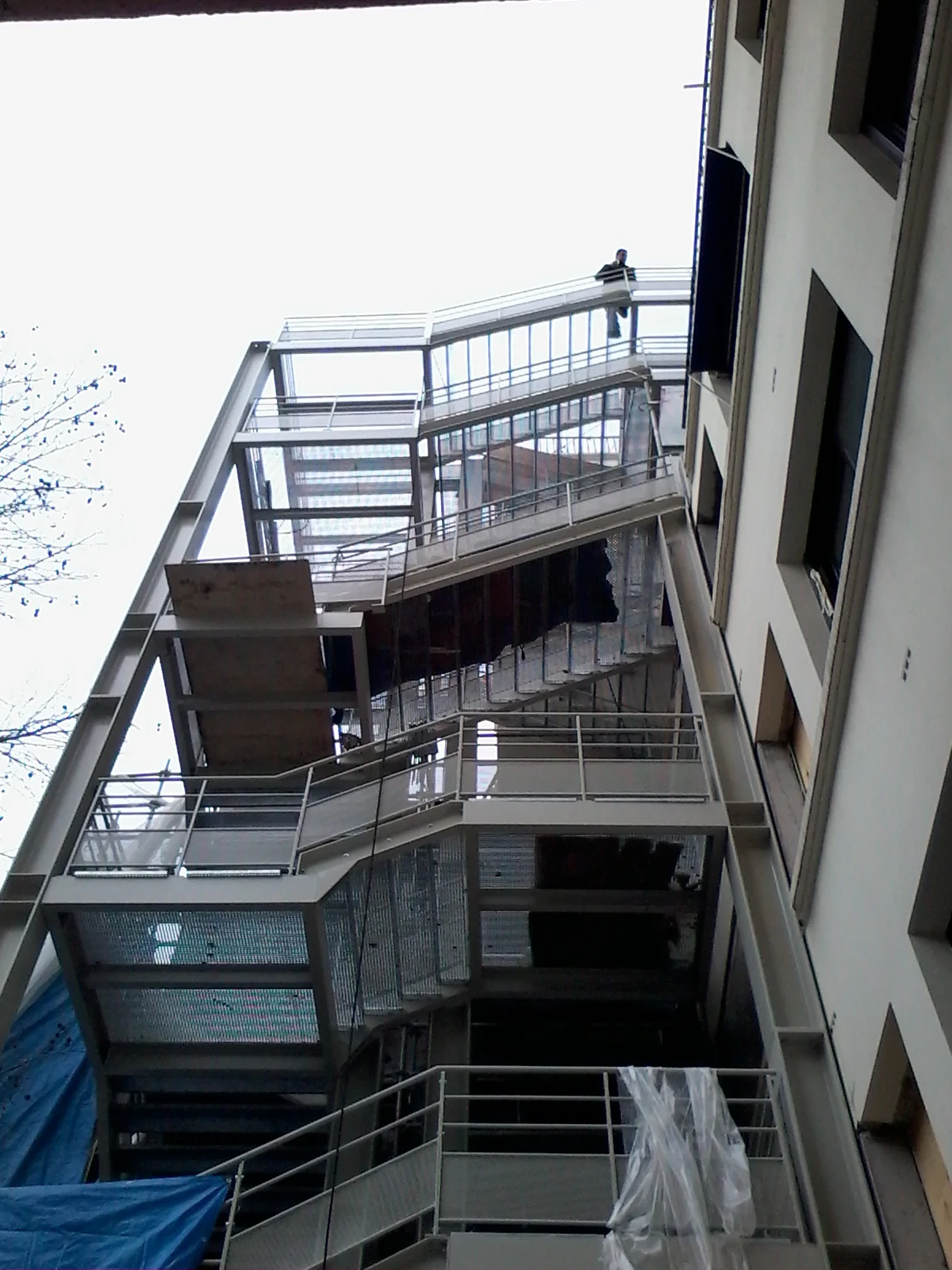 Réalisation d'un escalier extérieur thermolaqué de 30 tonnes, encloisonné par une maille inox, le tout sur 7 étages + 1 RDC.