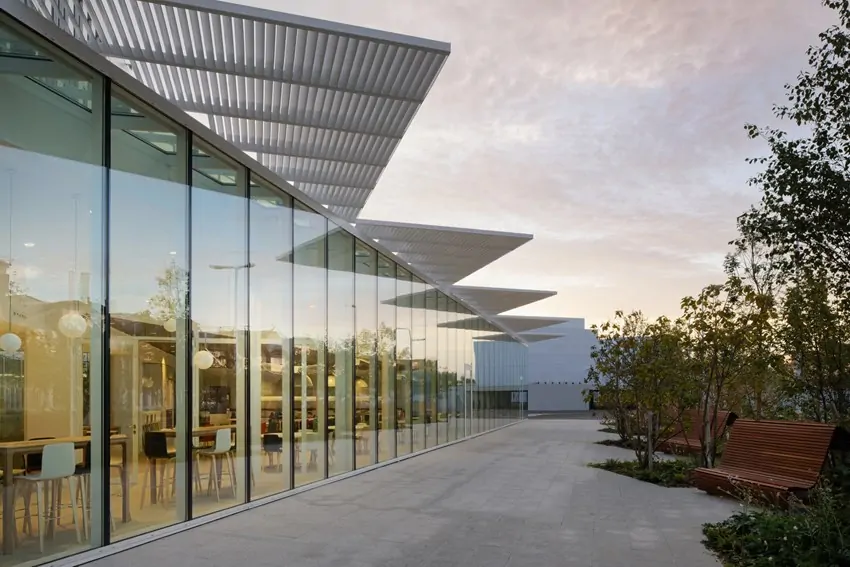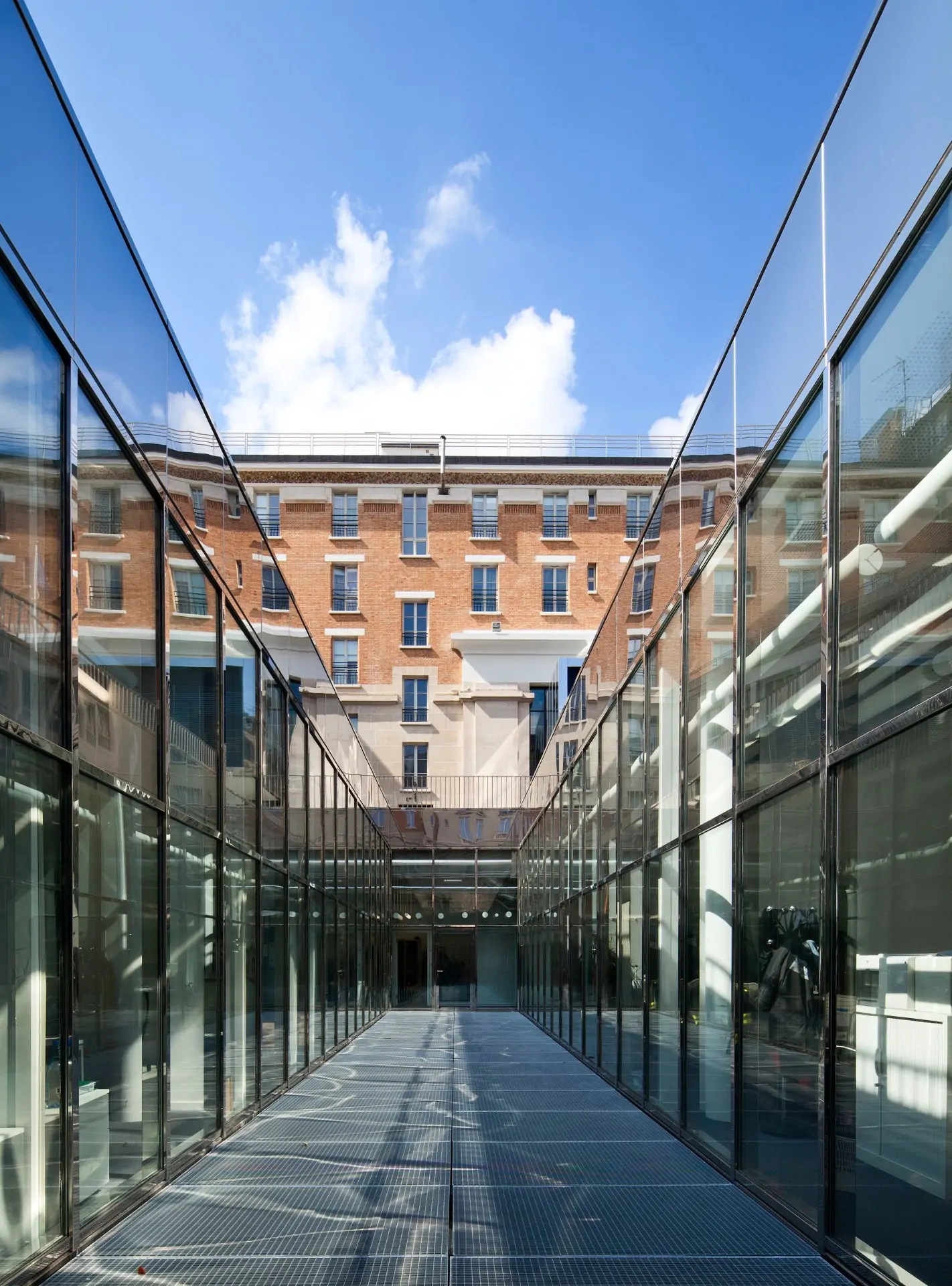 Conception des douves – passerelles – escaliers – cloisons coupe-feu – garde-corps butée à camion de pompier – mur rideau acier Jansen poli miroir – caillebotis chemin de douve, etc.